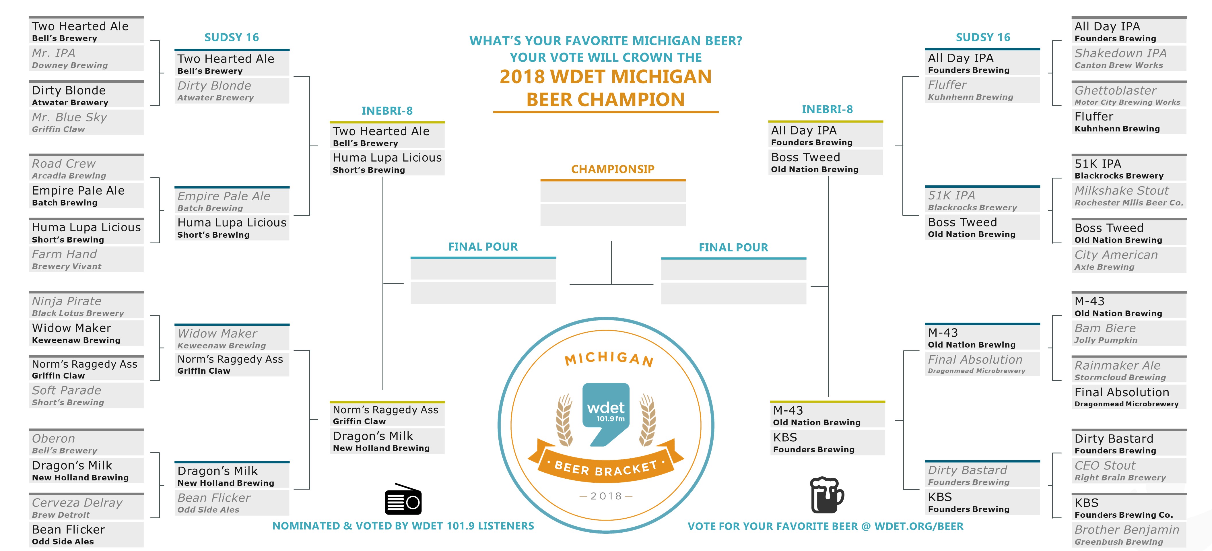 - Beers with the most votes will advance to the the Final Pour in the 2018 WDET Michigan Beer Bracket on Wednesday, October 24th (voting for this round ends at midnight on Tuesday October 23rd).