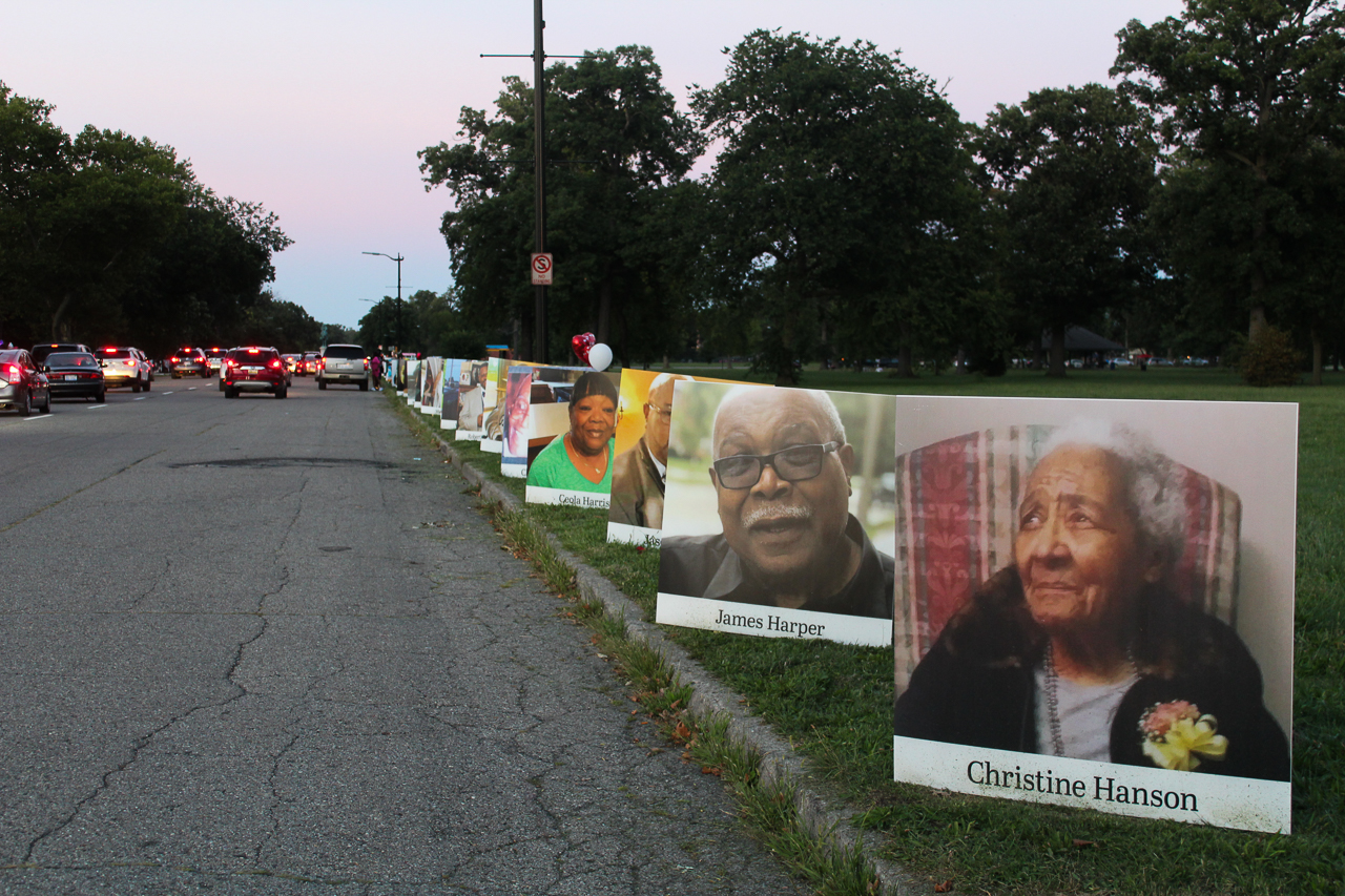 The day-long procession includes hundreds of cars and fifteen empty hearses symbolizing the 1500 Detroiters who’ve already died from COVID-19. As the vehicles cruise down the roadways of the island, they pass, one after another, poster-sized pictures of the deceased. Nearly one thousand portraits in all.