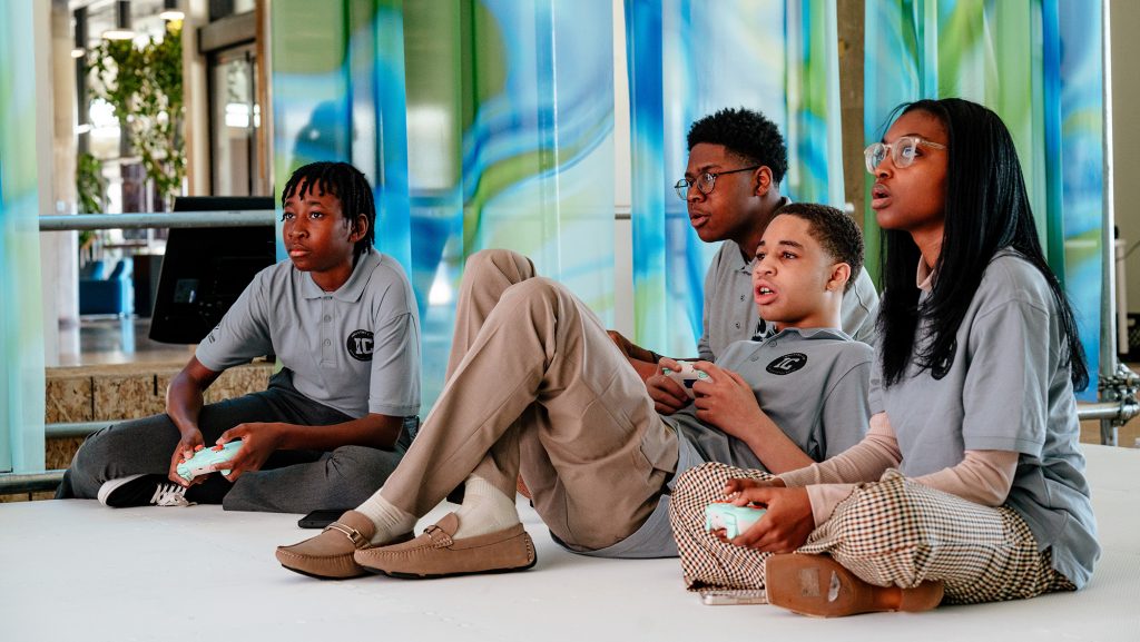 Students playing the games they designed at the Detroit at Play Co-Designed Video Games Exhibition.