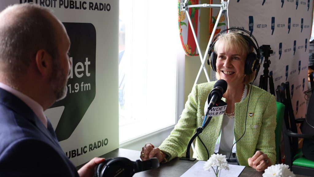Wayne State University President Kimberly Andrews Espy speaks with WDET's Russ McNamara at the 2025 Mackinac Policy Conference on Mackinac Island.