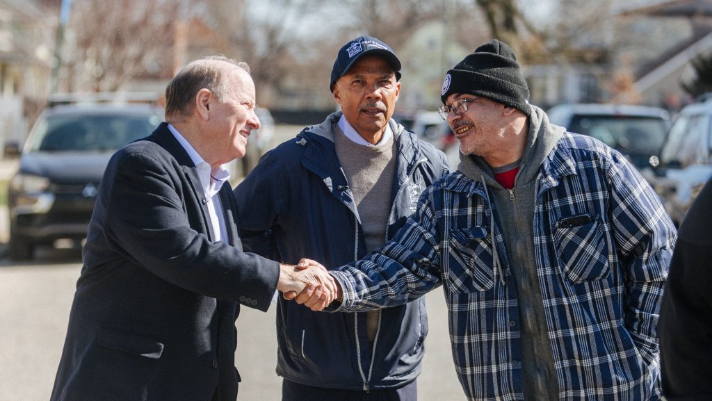 Detroit Mayor Mike Duggan shakes hands with a resident at a press conference in Southwest Detroit.