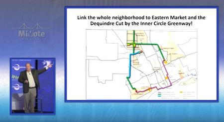 Touted by Mayor Mike Duggan at the recent Mackinac Policy Conference, the roughly 30-mile route would circle through Detroit and Hamtramck and incorporate existing bike lanes in downtown and southwest Detroit as well as greenways. He highlighted the section along McNichols Road. “We’re going to build a greenway through the neighborhood,” Duggan said. “We’re actually going to build a greenway that’s going to look like the Dequindre Cut to connect UD Mercy on the east and Marygrove on the west and that big blue section in the middle is going to be a beautiful park.”