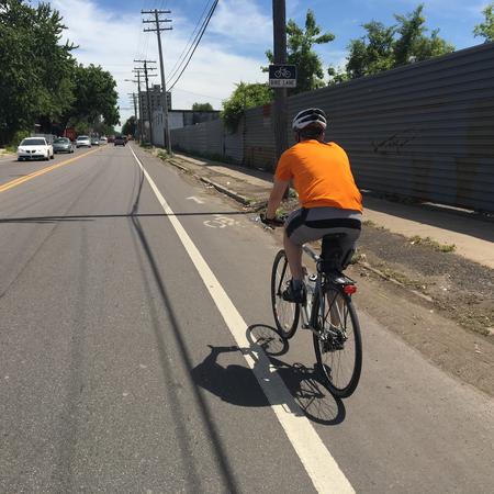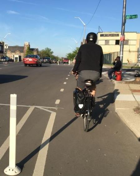 “Those are some of the newest facilities in the city. Those just got built in fall of 2015. It was a total change where we actually moved the parking from being along the curb to out along traffic. It creates a protected space where the cyclist doesn’t have to be right adjacent to moving cars. It’s kind of going to be the model and the template for a lot of the new facilities in the city. … It was totally studied with traffic beforehand, so we left plenty of lanes. There’s still two-lanes in each direction for traffic. We made sure we could accommodate all the turns. It’s different, something people have to get used to, seeing the parked cars along the road. … No impact on traffic from what we’ve heard right now. I think people are getting real comfortable on them. Parking is moved from being against the curb to about seven or eight feet out from the curb. There’s just a paint stripe and then there’s these plastic delineators. It’s just basically a plastic post just to kind of reinforce the parking versus the bike lanes. It gives people a more comfortable safer place to bike in.” — Mike Darga, senior project engineer at Giffels Webster engineering firm in Detroit.