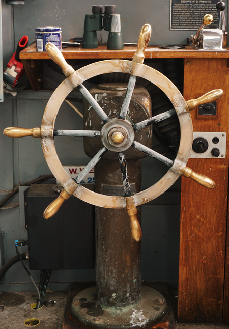 The speaker crackles that a vessel is approaching and veteran Captain Sam Buchanan heads towards the dock alongside the building.