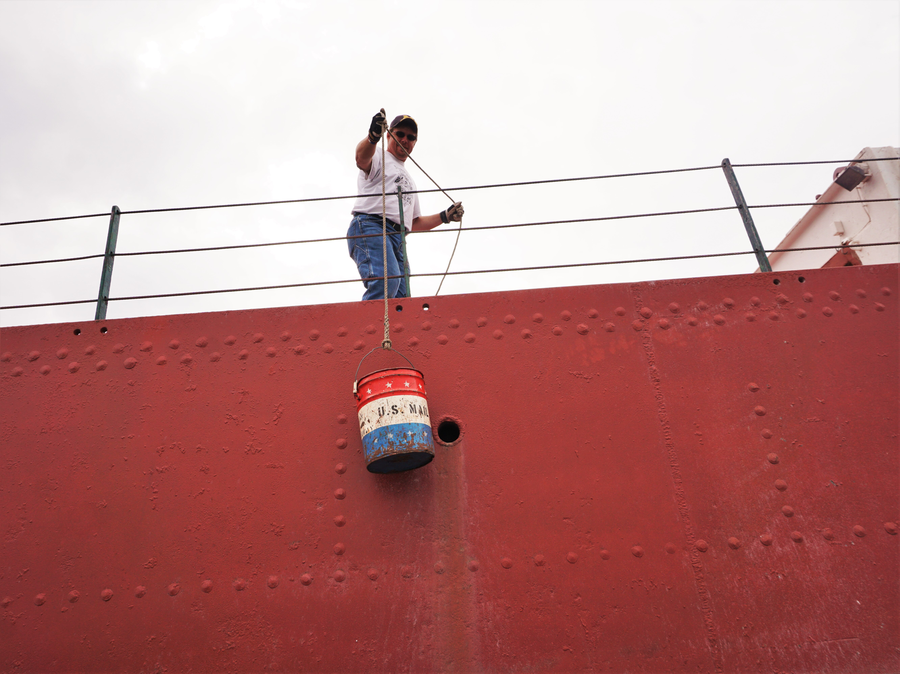 The freighter’s crew begins the not-so-high-tech job of transferring letters by lowering a bucket down to Buchanan’s boat.