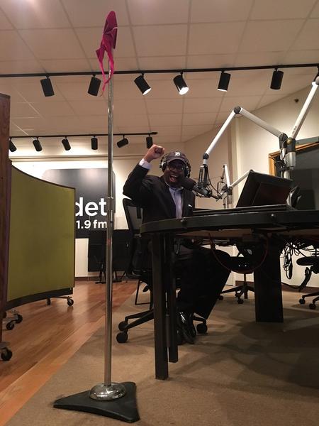 Stephen Henderson smiles with WDET's Festivus Pole in the studio in 2016.