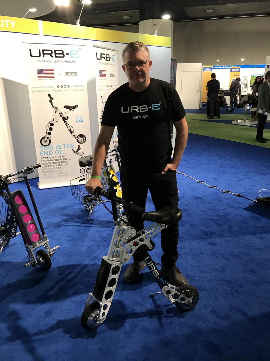 You still won’t find flying cars at the 2017 North American International Auto Show. But WDET’s Pat Batcheller did find a two-wheeled terrestrial transport during media previews at Cobo Center. The URB-E is an electric bicycle that you can fold and carry by the handle. Designer and URB-E co-founder Grant Delgatty says the bike weighs about 30 pounds, so mass transit users can take it with them. The battery in the front of the bike can be removed and is capable of charging up to seven devices. It also has a USB port and a flexible mount for a mobile phone. Click on the audio link to hear the conversation.