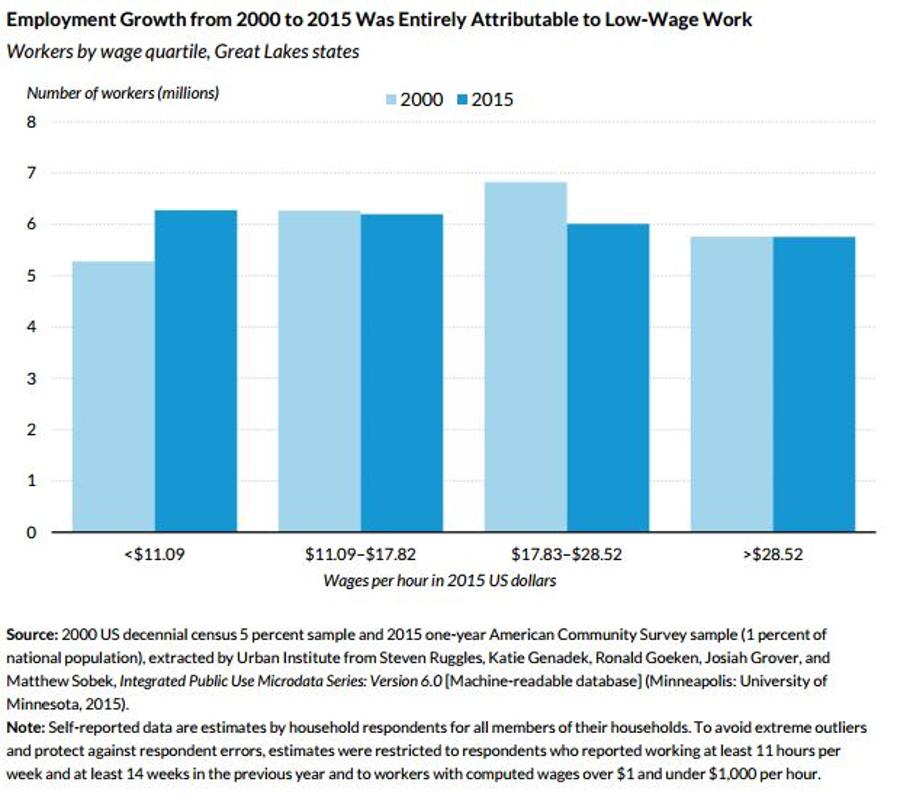 The findings are in the Urban Institute’s report, “The Future of the Great Lakes Region”. One of the authors, Rolf Pendall, says the health care and hospitality industries have seen the strongest job growth. But it comes with a cost.
