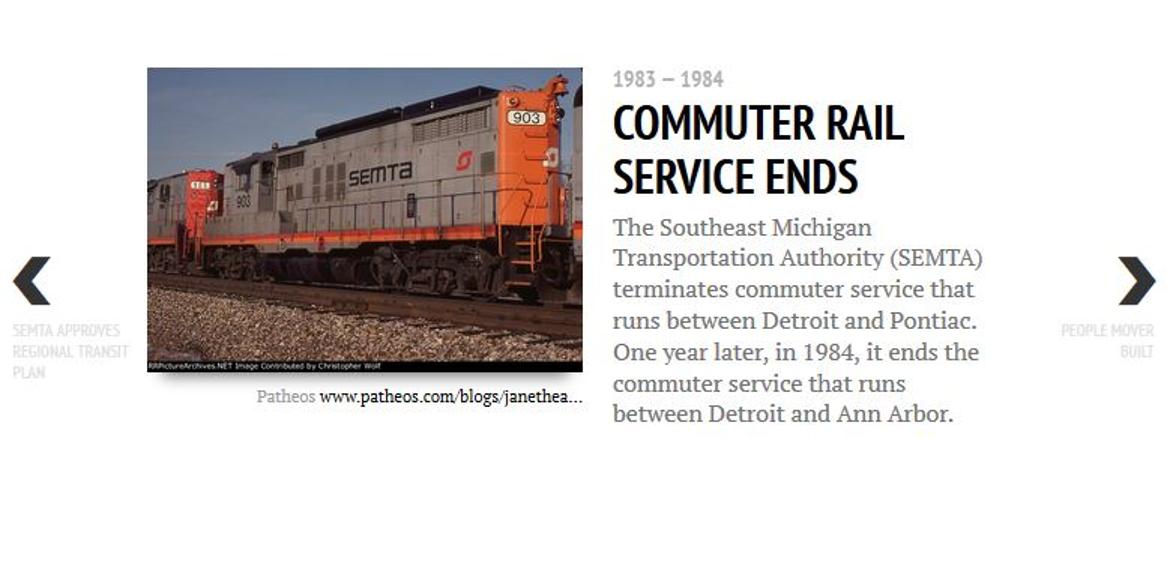 Did you know that commuter rail service ran between Detroit and Ann Arbor as late as 1984? Or that Detroit considered implementing a subway system in 1920? Click through the timeline to see archival photos and newspaper clippings highlighting major events in Southeast Michigan’s mass transit history. Warning: The journey is a bit of a roller coaster.