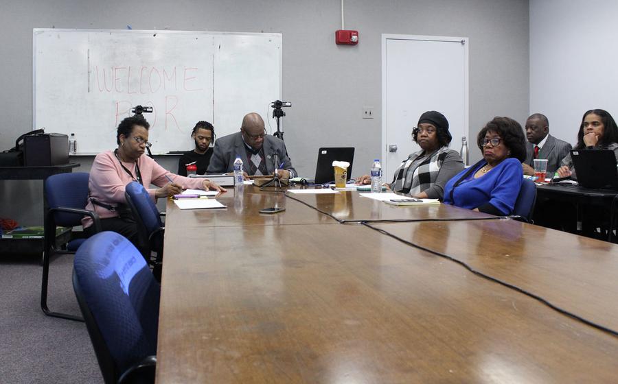 The appeal hearings take place on the 8th floor of the Coleman A. Young Municipal Center in a windowless room. There’s a long boardroom table that seats members of the Board of Review. A white board has “WELCOME B-O-R” written on it in red marker, all caps.