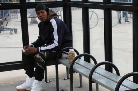 The first person I meet, Derrick Carter, sits inside a glass bus shelter. Most people here have masks or gloves on, but not Carter.