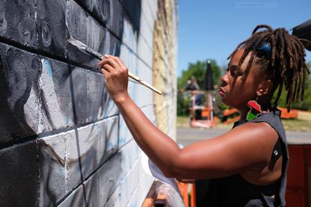 The talent working on the wall is just as notable as the project itself. As the popularity of public art grows around the country, few queer or female-identifying muralists get as much work as their male counterparts do. James says she’s often the only Black female artist at the street art festivals she’s regularly invited to paint at.