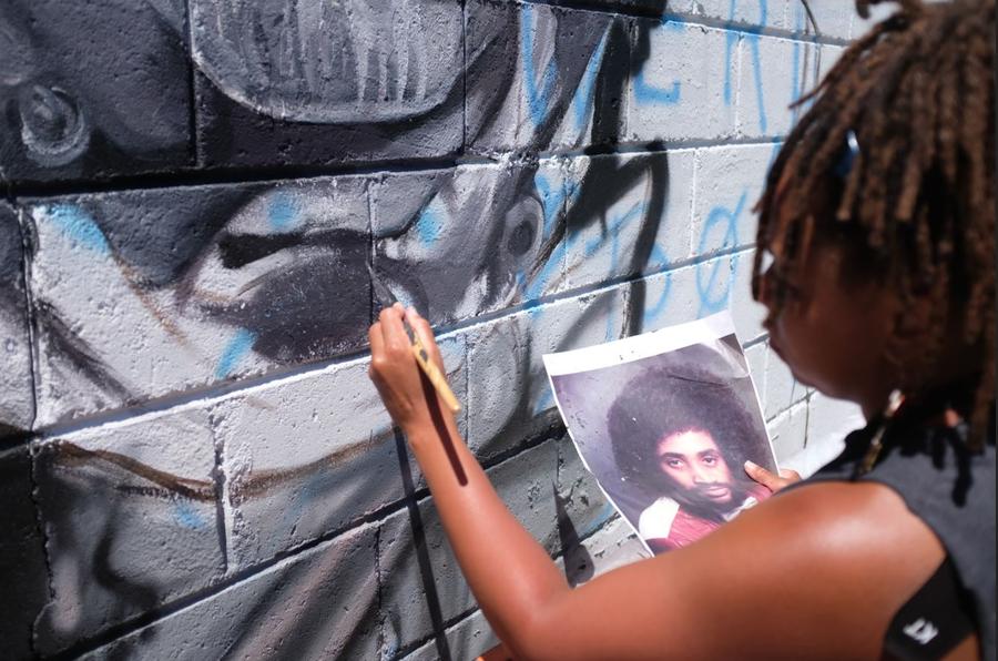 The mural James is painting is a portrait of Malice Green — a 35-year-old Black Detroiter who became the face of police brutality around the country on November 5th, 1992 when he was killed by two white Detroit police officers on the city’s west side.