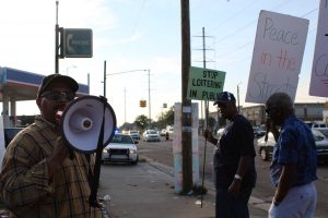 On a sunny, September evening, about two dozen people were holding signs and marching at a gas station on the...